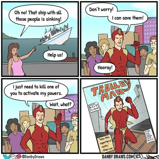 I know it’s a joke. But this could actually be an interesting plot setup, with one modification. I would make it so that Trolley man couldn’t actually save anyone himself. Rather, he has the power to temporarily give anyone powers equivalent to Superman or similar. The only problem is this is so stressful on the person’s body that the power up kills them after it wears off.