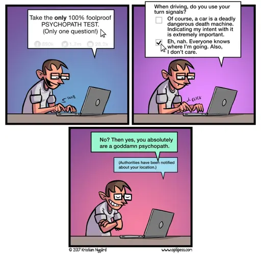 I just recently watched a QI clip where they said they used to have a long list of questions to determine if someone was a narcissist, but they realized that they got the same accuracy from a single question, “Are you a narcissist?”