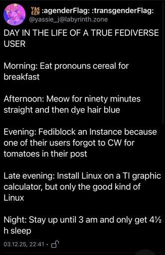 arrow-up1654arrow-down1imageDay in the Life of a True Fediverse Usersh.itjust.worksSamskara@sh.itjust.works to Fediverse memes@feddit.ukEnglish · 15 days agomessage-square129fedilink