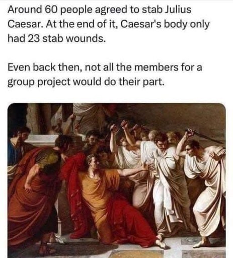 The symbolism of 60 senators and 60 stab wounds. But, in practicality, by #23, a full freakout was probably going on, so #24 was probably like “Oh, hey, can I just get in here real quick and just… ok, fine! Never mind.”