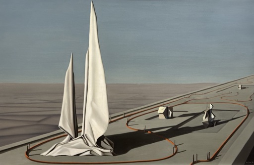 Sage depicted a large, two-pronged structure resembling drapery, which rises straight up into the air from a ramp or dock that recedes into the distance at right and is punctuated by geometric and curvilinear forms. The striking canvas suggests the mystifying environs of a dreamscape, reflecting Sage’s fascination with the unconscious. In the mid-193os, the artist lived in Paris and worked alongside French Surrealists, including Yves Tanguy, whom she married in 1940 after moving to New York at the outbreak of World War II. Painted in 1944, In the Third Sleep attests to her continued investigation of the otherworldly.