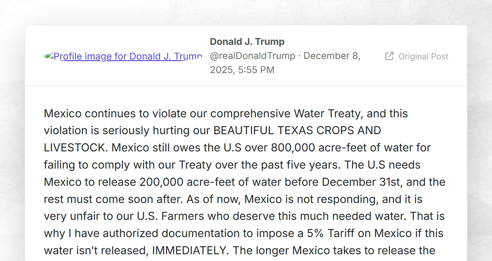 arrow-up189arrow-down1external-linkTrump threatens new tariffs unless Mexico hands over more waterplus-squaretrumpstruth.orgKing@sh.itjust.works to politics @lemmy.world · 3 days agomessage-square23fedilink